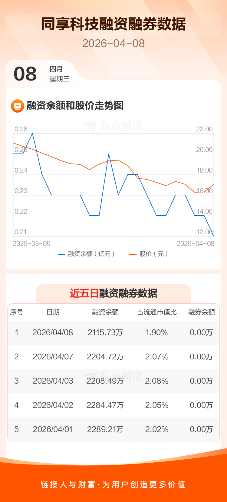 交易所最新数据显示,同享科技于2026年4月8日获融资买入53.82万元,融资偿还142.81万元,当日融资净偿还88.99万元。目前,该股融资余额2115.73万,占流通市值比例为1.90%。
