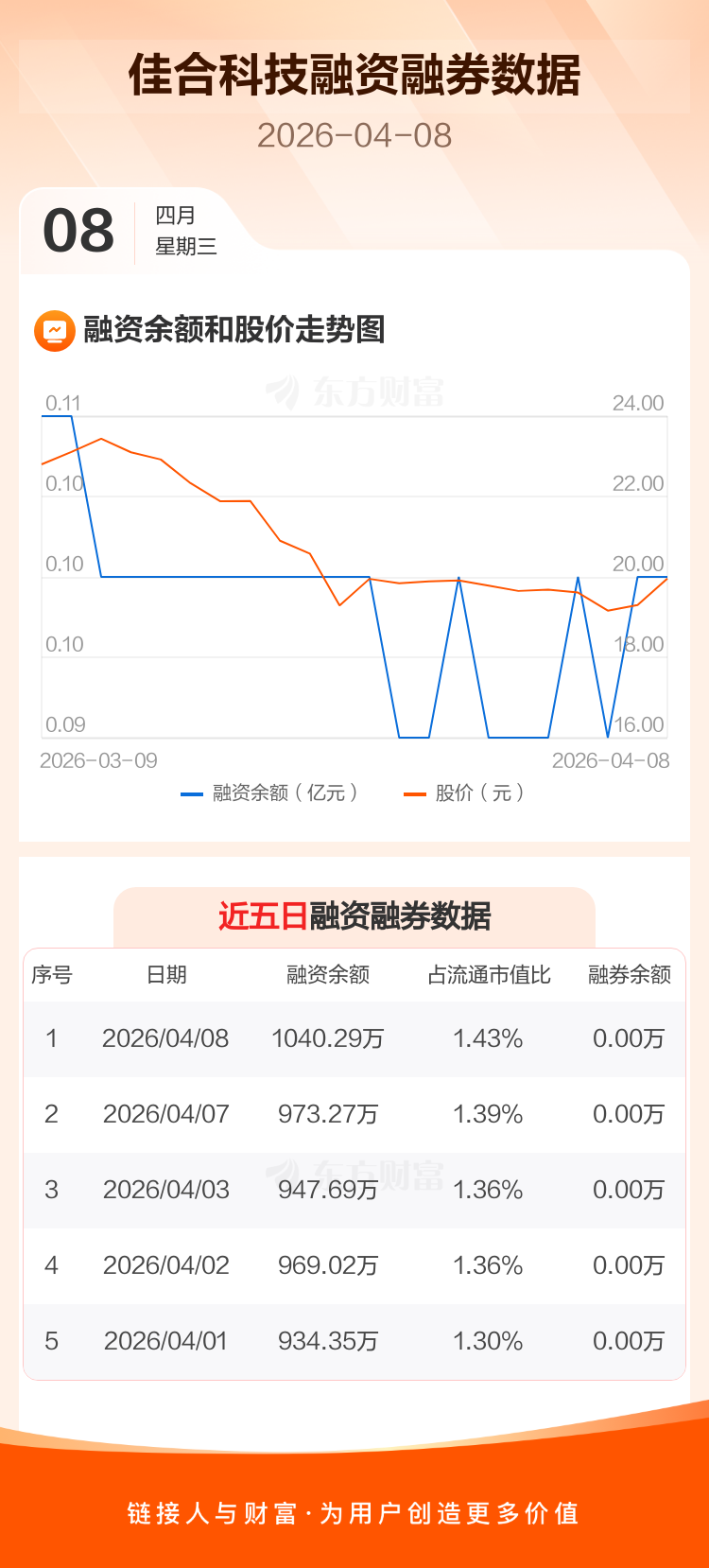 交易所最新数据显示,佳合科技于2026年4月8日获融资买入106.49万元,融资偿还39.46万元,当日融资净买入67.02万元。目前,该股融资余额1040.29万,占流通市值比例为1.43%。
