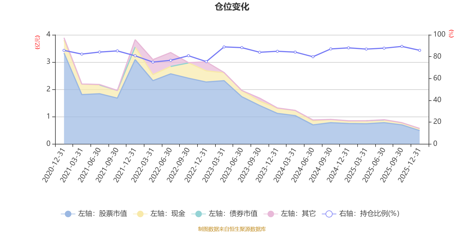 据定期报告数据统计,近三年平均股票仓位为86.26%,同类平均为84.04%。2025年三季度末基金达到89.39%的最高仓位,2022年一季度末最低,为75.01%。