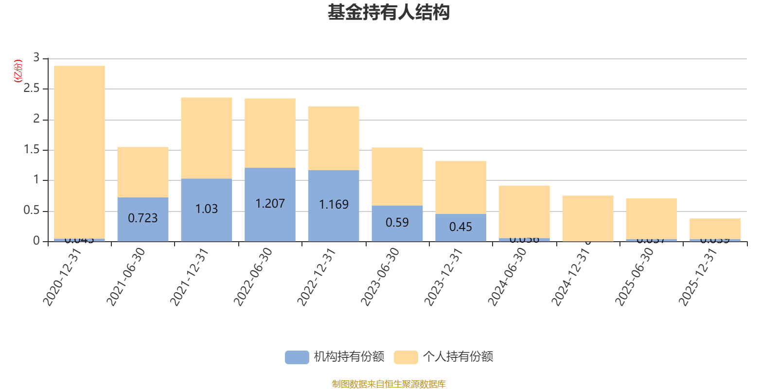 截至2025年12月31日,基金持有人共计480户,合计持有3764.56万份。其中管理人员工持有4.36万份,占比0.12%,机构持有份额占比10.32%,个人投资者占比89.68%。