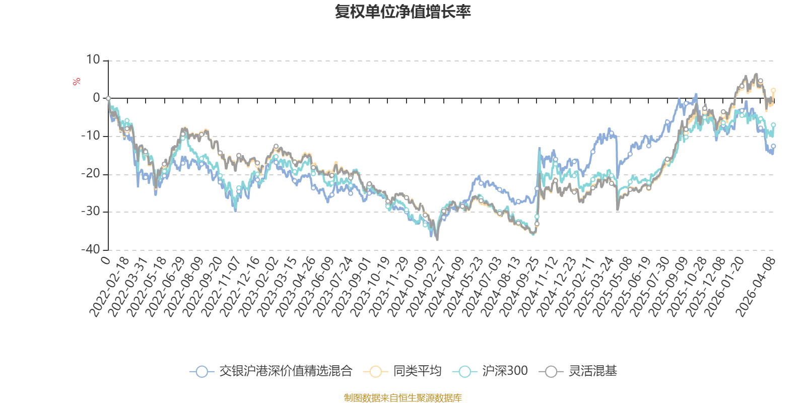 截至4月8日,交银沪港深价值精选混合近三个月复权单位净值增长率为-7.88%,位于同类可比基金1179/1287;近半年复权单位净值增长率为-13.41%,位于同类可比基金1232/1286;近一年复权单位净值增长率为9.60%,位于同类可比基金1067/1286;近三年复权单位净值增长率为9.48%,位于同类可比基金749/1286。