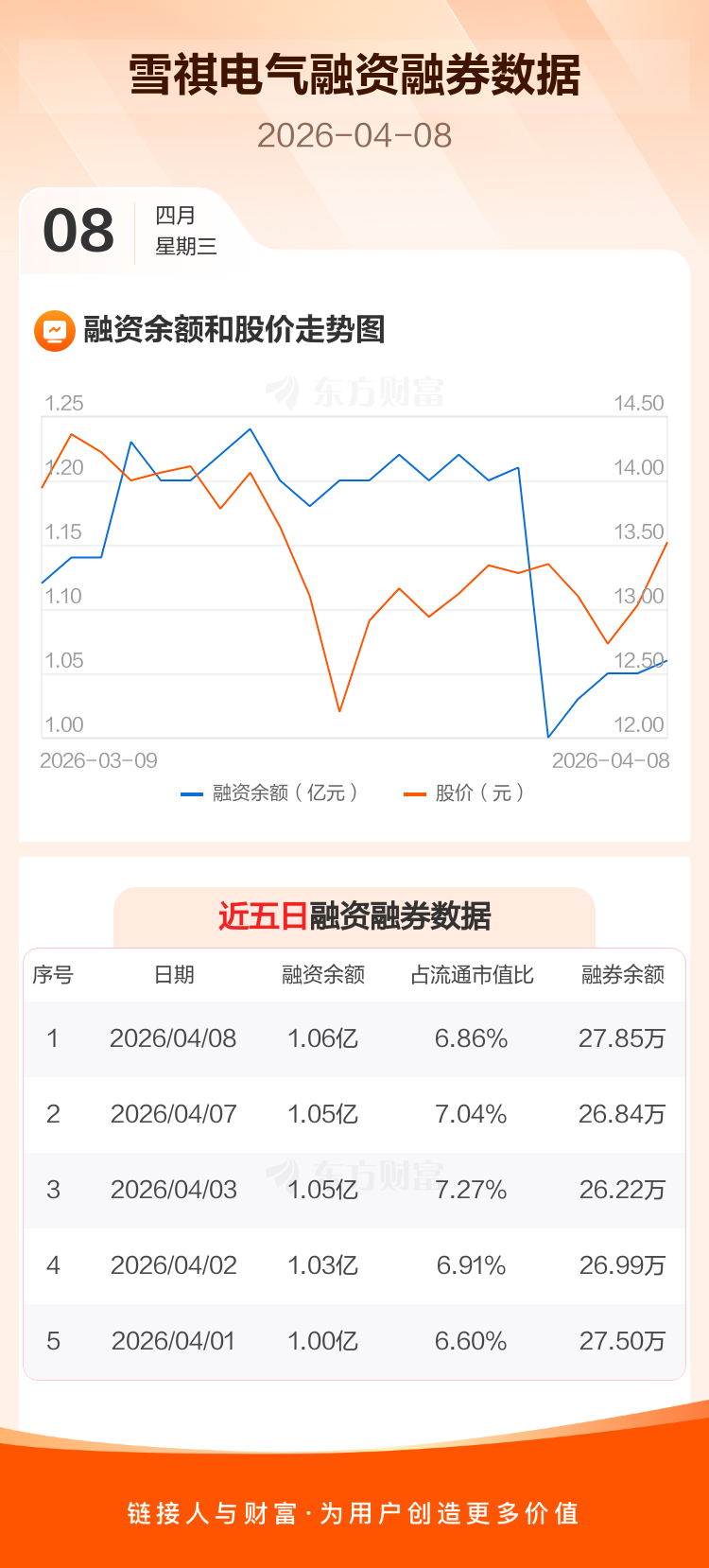交易所最新数据显示,雪祺电气于2026年4月8日获融资买入656.77万元,融资偿还542.42万元,当日融资净买入114.34万元。目前,该股融资余额1.06亿,占流通市值比例为6.86%。