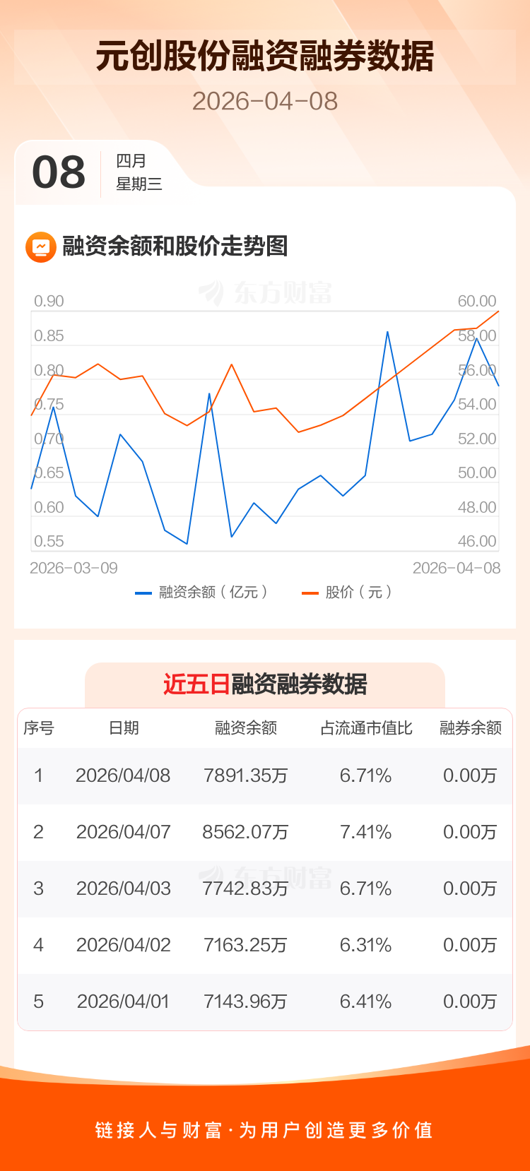 交易所最新数据显示,元创股份于2026年4月8日获融资买入2275.76万元,融资偿还2946.48万元,当日融资净偿还670.72万元。目前,该股融资余额7891.35万,占流通市值比例为6.71%。