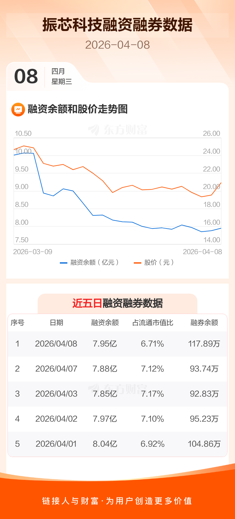 交易所最新数据显示,振芯科技于2026年4月8日获融资买入3096.63万元,融资偿还2310.09万元,当日融资净买入786.54万元。目前,该股融资余额7.95亿,占流通市值比例为6.71%。