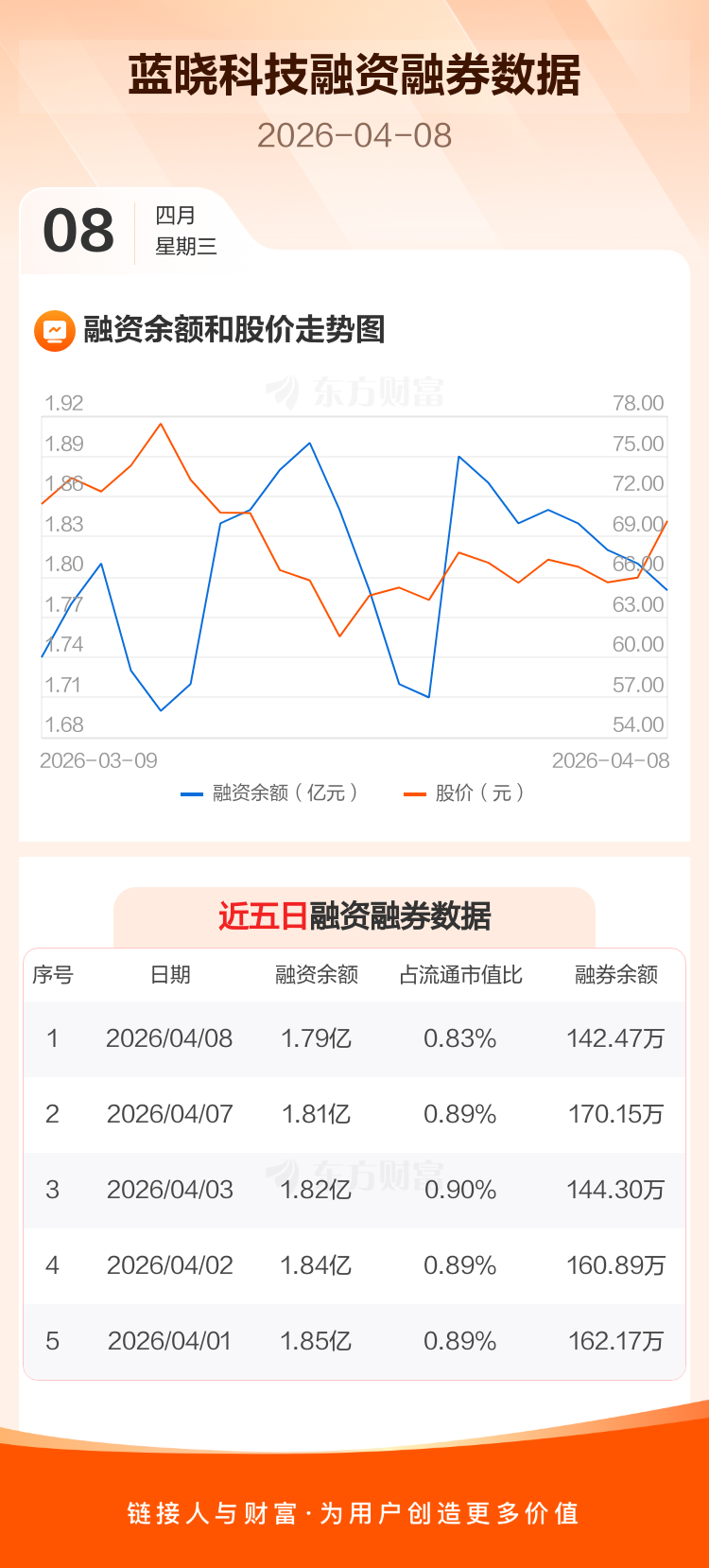 交易所最新数据显示,蓝晓科技于2026年4月8日获融资买入1202.01万元,融资偿还1446.78万元,当日融资净偿还244.76万元。目前,该股融资余额1.79亿,占流通市值比例为0.83%。
