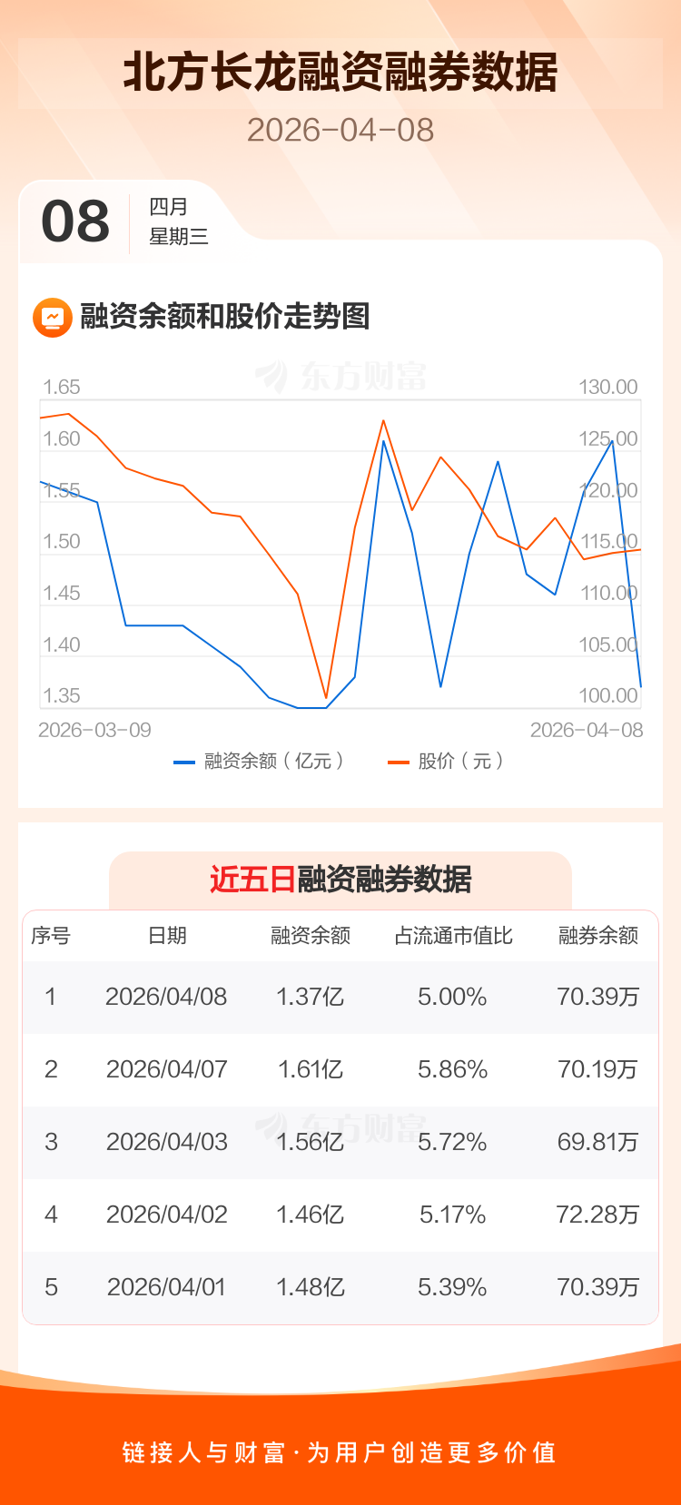 交易所最新数据显示,北方长龙于2026年4月8日获融资买入3194.32万元,融资偿还5507.75万元,当日融资净偿还2313.43万元。目前,该股融资余额1.37亿,占流通市值比例为5.00%。
