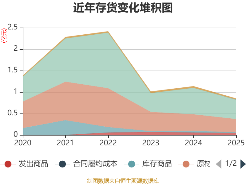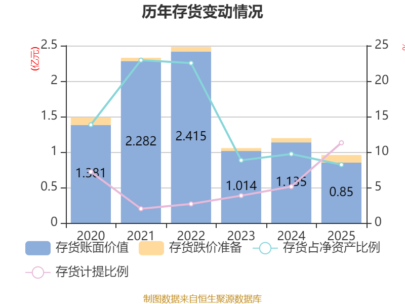 从存货变动来看,截至2025年末,公司存货账面价值为8498.29万元,占净资产的8.21%,较上年末减少2847.38万元。其中,存货跌价准备为1082.52万元,计提比例为11.3%。