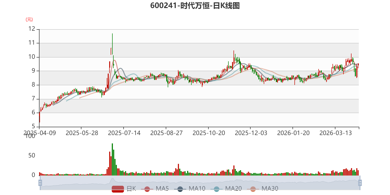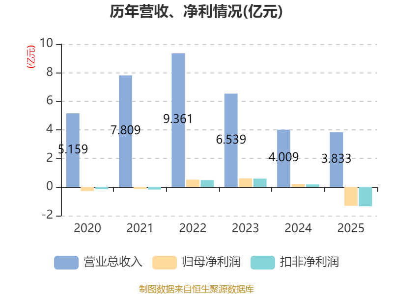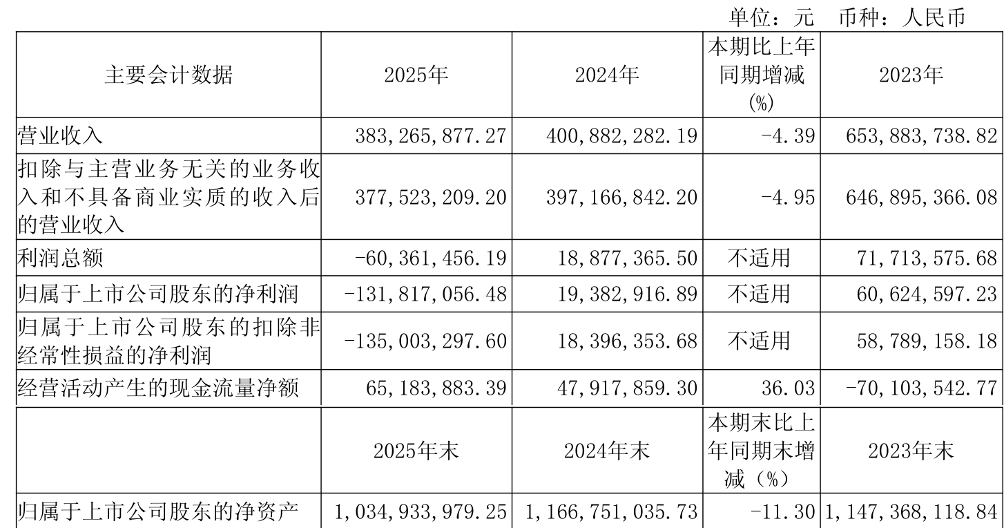 中证智能财讯时代万恒(600241)4月9日披露2025年年度报告。2025年,公司实现营业总收入3.83亿元,同比下降4.39%;归母净利润亏损1.32亿元,上年同期盈利1938.29万元;扣非净利润亏损1.35亿元,上年同期盈利1839.64万元;经营活动产生的现金流量净额为6518.39万元,同比增长36.03%;报告期内,时代万恒基本每股收益为-0.45元,加权平均净资产收益率为-11.97%。