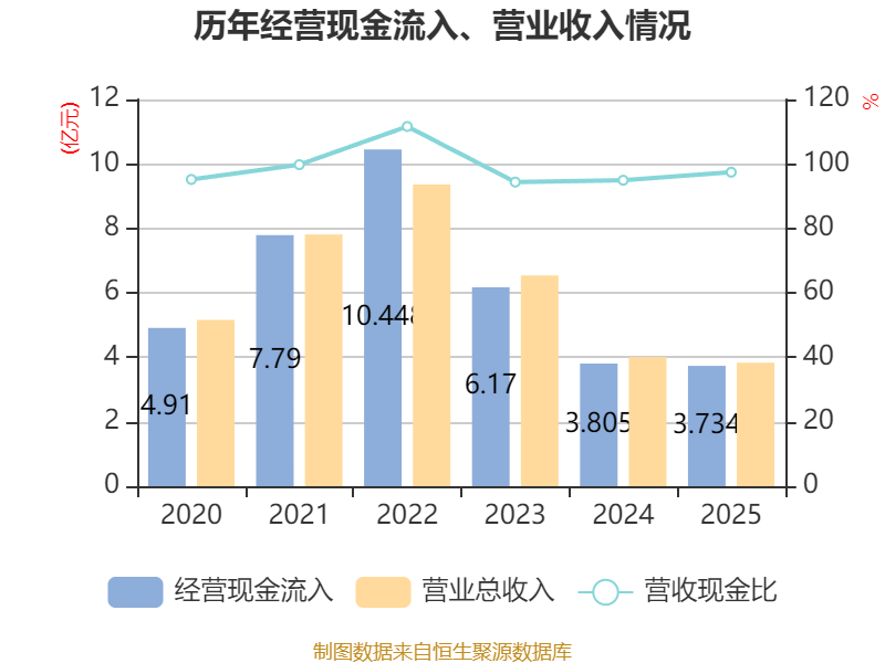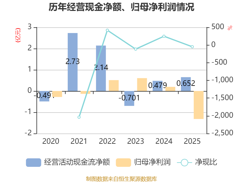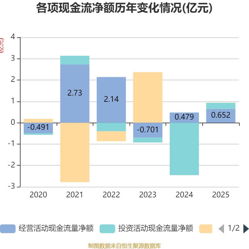 截至2025年,公司经营活动现金流净额为6518.39万元,同比增长36.03%;筹资活动现金流净额75.86万元,同比增加74万元;投资活动现金流净额2820.02万元,上年同期为-2.46亿元。