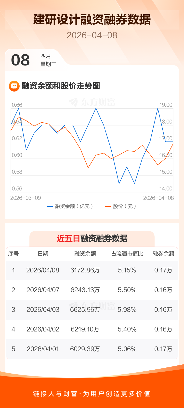 交易所最新数据显示,建研设计于2026年4月8日获融资买入488.53万元,融资偿还558.79万元,当日融资净偿还70.27万元。目前,该股融资余额6172.86万,占流通市值比例为5.15%。