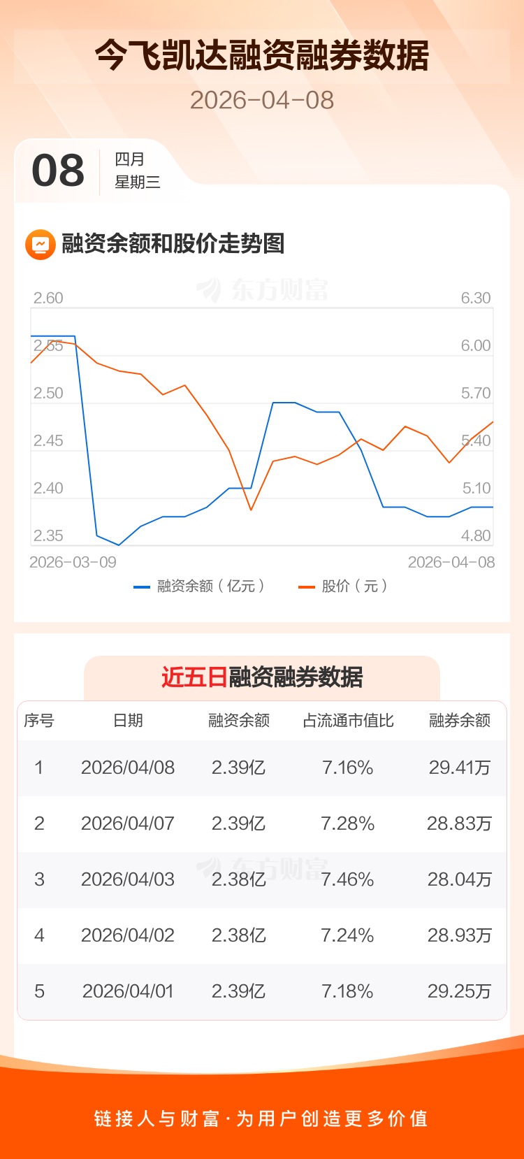 交易所最新数据显示,今飞凯达于2026年4月8日获融资买入836.44万元,融资偿还765.55万元,当日融资净买入70.89万元。目前,该股融资余额2.39亿,占流通市值比例为7.16%。