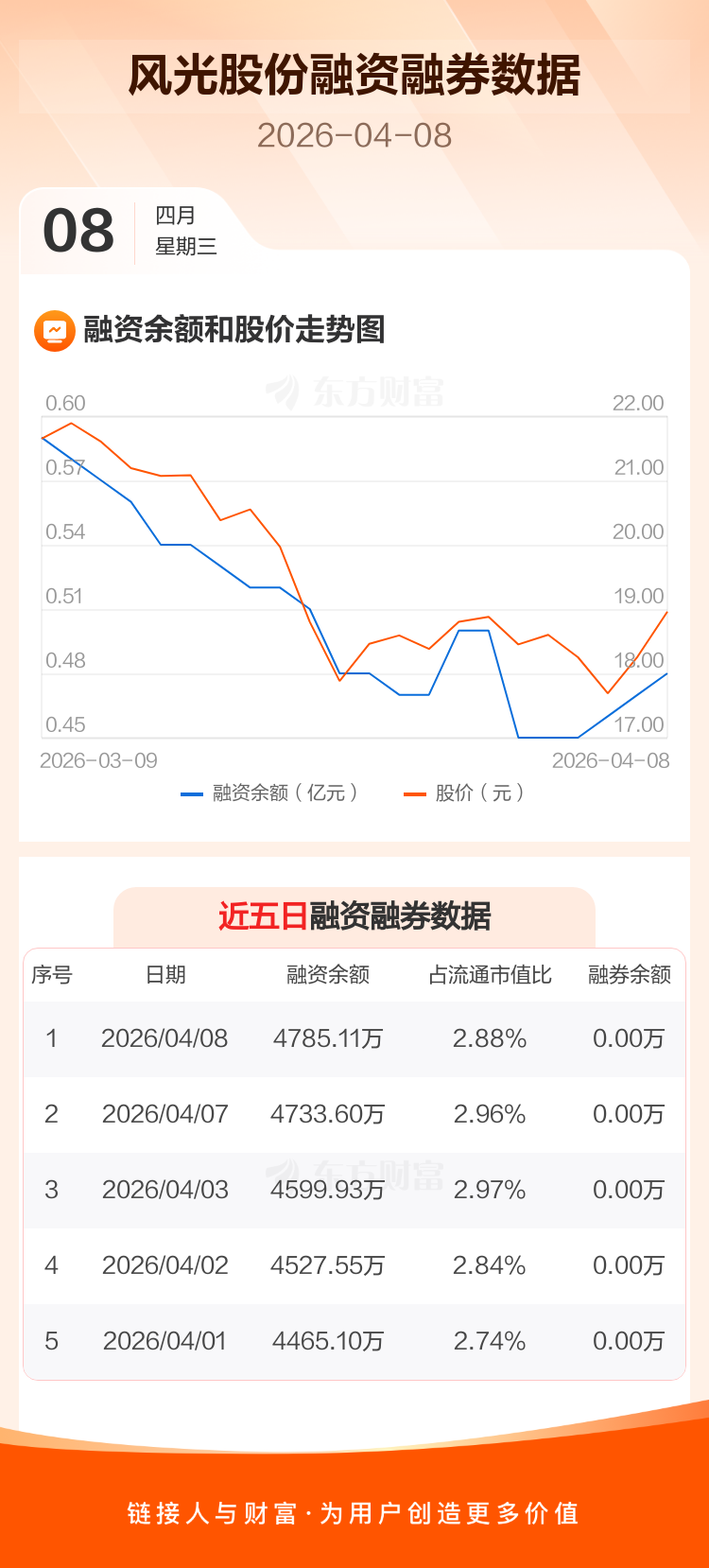 交易所最新数据显示,风光股份于2026年4月8日获融资买入265.24万元,融资偿还213.73万元,当日融资净买入51.51万元。目前,该股融资余额4785.11万,占流通市值比例为2.88%。