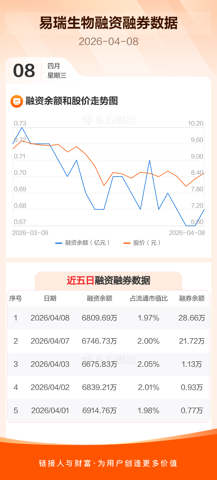交易所最新数据显示,易瑞生物于2026年4月8日获融资买入486.68万元,融资偿还423.72万元,当日融资净买入62.96万元。目前,该股融资余额6809.69万,占流通市值比例为1.97%。