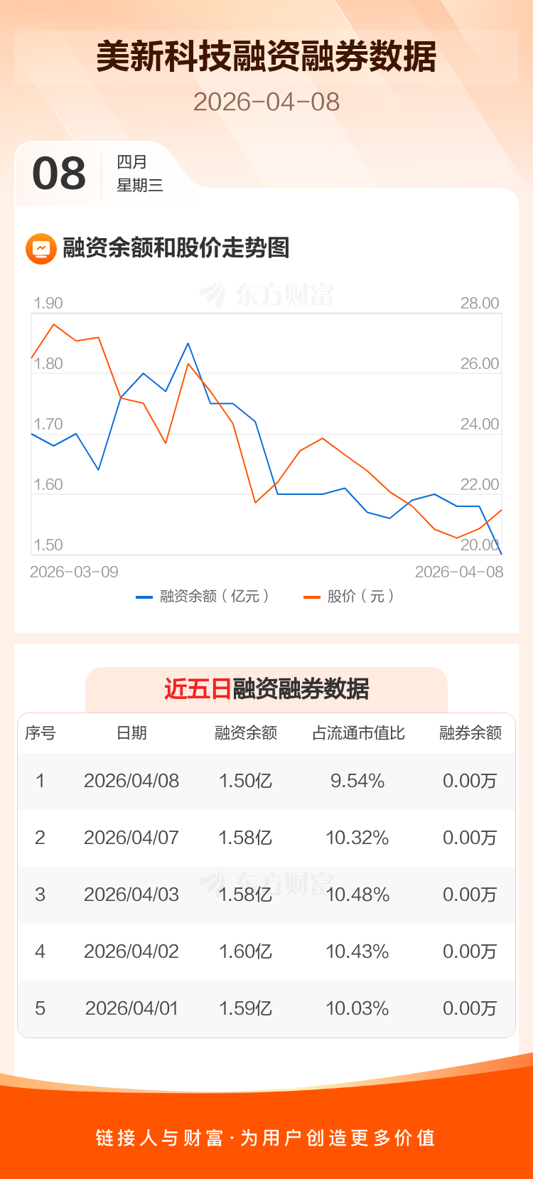 交易所最新数据显示,美新科技于2026年4月8日获融资买入1225.51万元,融资偿还1981.58万元,当日融资净偿还756.07万元。目前,该股融资余额1.50亿,占流通市值比例为9.54%。