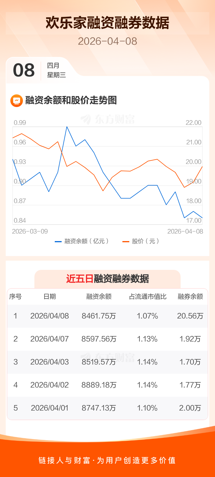 交易所最新数据显示,欢乐家于2026年4月8日获融资买入523.66万元,融资偿还659.48万元,当日融资净偿还135.81万元。目前,该股融资余额8461.75万,占流通市值比例为1.07%。