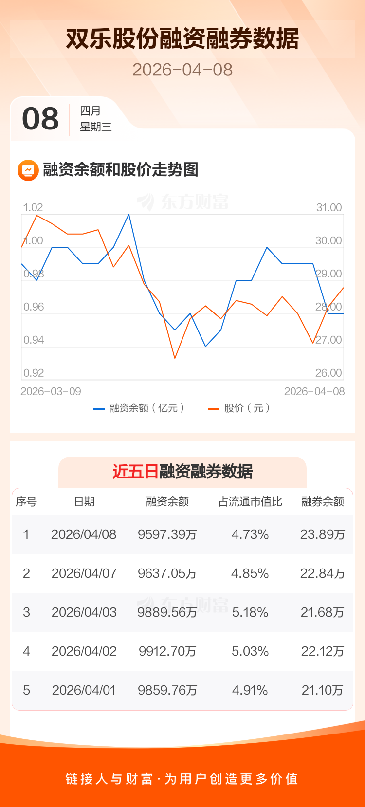 交易所最新数据显示,双乐股份于2026年4月8日获融资买入661.09万元,融资偿还700.74万元,当日融资净偿还39.66万元。目前,该股融资余额9597.39万,占流通市值比例为4.73%。