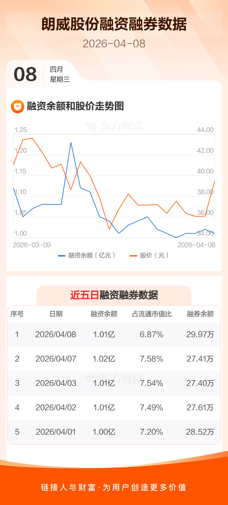 交易所最新数据显示,朗威股份于2026年4月8日获融资买入1087.02万元,融资偿还1169.64万元,当日融资净偿还82.62万元。目前,该股融资余额1.01亿,占流通市值比例为6.87%。