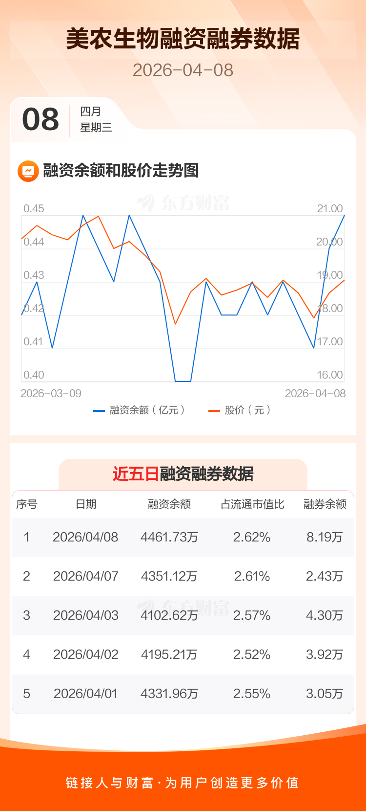 交易所最新数据显示,美农生物于2026年4月8日获融资买入420.76万元,融资偿还310.16万元,当日融资净买入110.6万元。目前,该股融资余额4461.73万,占流通市值比例为2.62%。