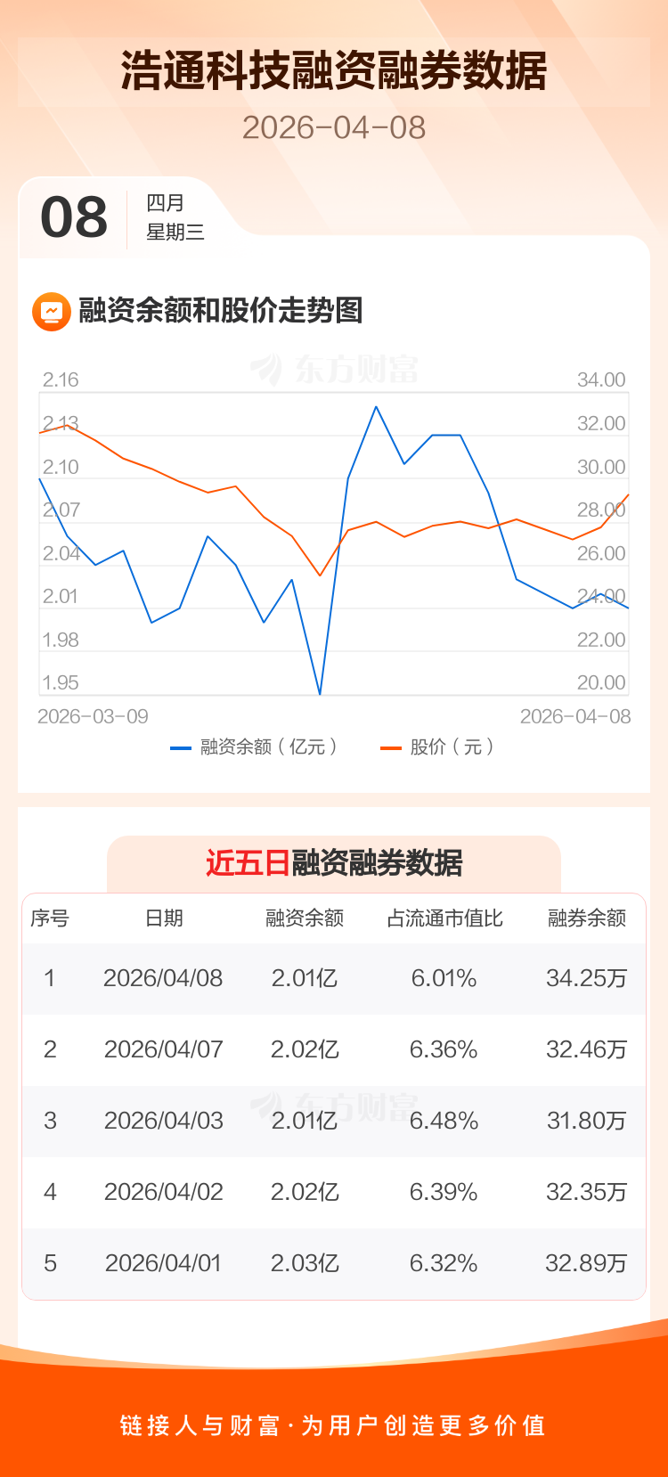 交易所最新数据显示,浩通科技于2026年4月8日获融资买入1383.94万元,融资偿还1446.14万元,当日融资净偿还62.21万元。目前,该股融资余额2.01亿,占流通市值比例为6.01%。