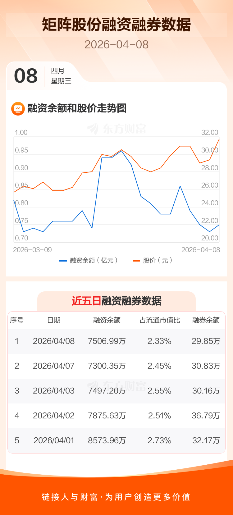 交易所最新数据显示,矩阵股份于2026年4月8日获融资买入2117.77万元,融资偿还1911.13万元,当日融资净买入206.64万元。目前,该股融资余额7506.99万,占流通市值比例为2.33%。