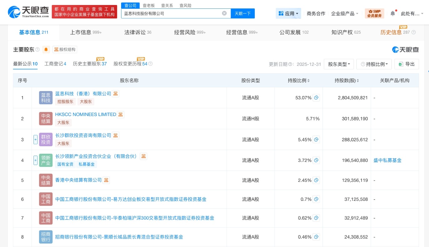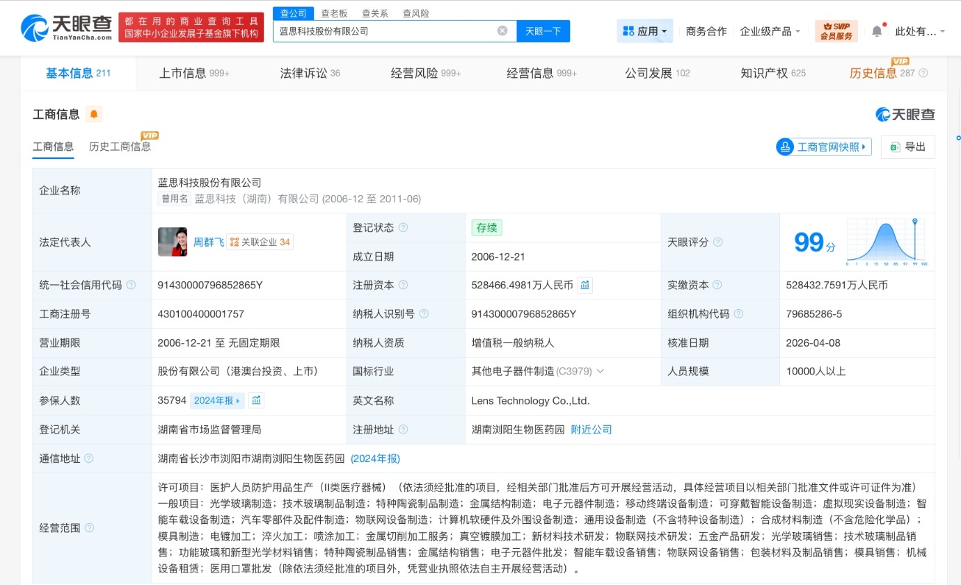 每经AI快讯,天眼查工商信息显示,近日,蓝思科技股份有限公司发生工商变更,注册资本由约49.8亿元人民币增至约52.8亿元人民币,增幅约6%。该公司成立于2006年12月,法定代表人为周群飞,经营范围包括光学玻璃制造、电子元器件制造、智能车载设备制造等。股东信息显示,该公司由蓝思科技(香港)有限公司、长沙群欣投资咨询有限公司等共同持股。
