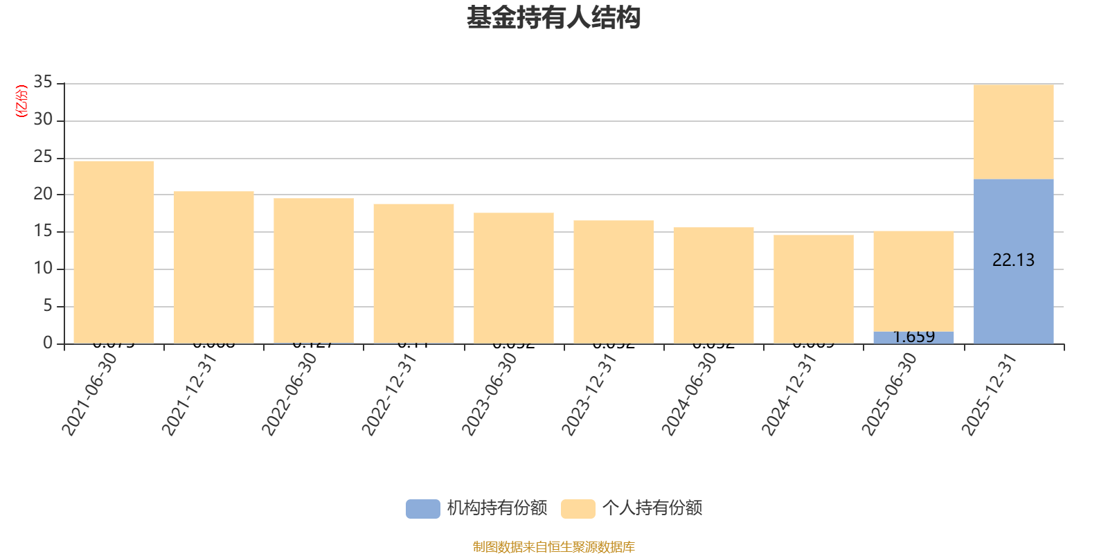 截至2025年12月31日,基金持有人共计2.18万户,合计持有34.78亿份。其中管理人员工持有295.34万份,占比0.08%,机构持有份额占比63.64%,个人投资者占比36.36%。