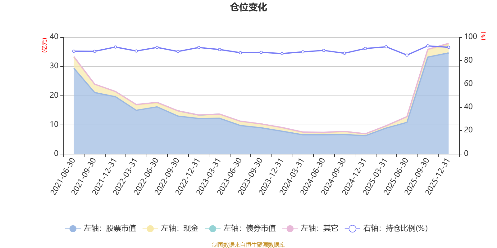 据定期报告数据统计,近三年平均股票仓位为88.52%,同类平均为88.27%。2025年三季度末基金达到92.57%的最高仓位,2025年上半年末最低,为84.69%。