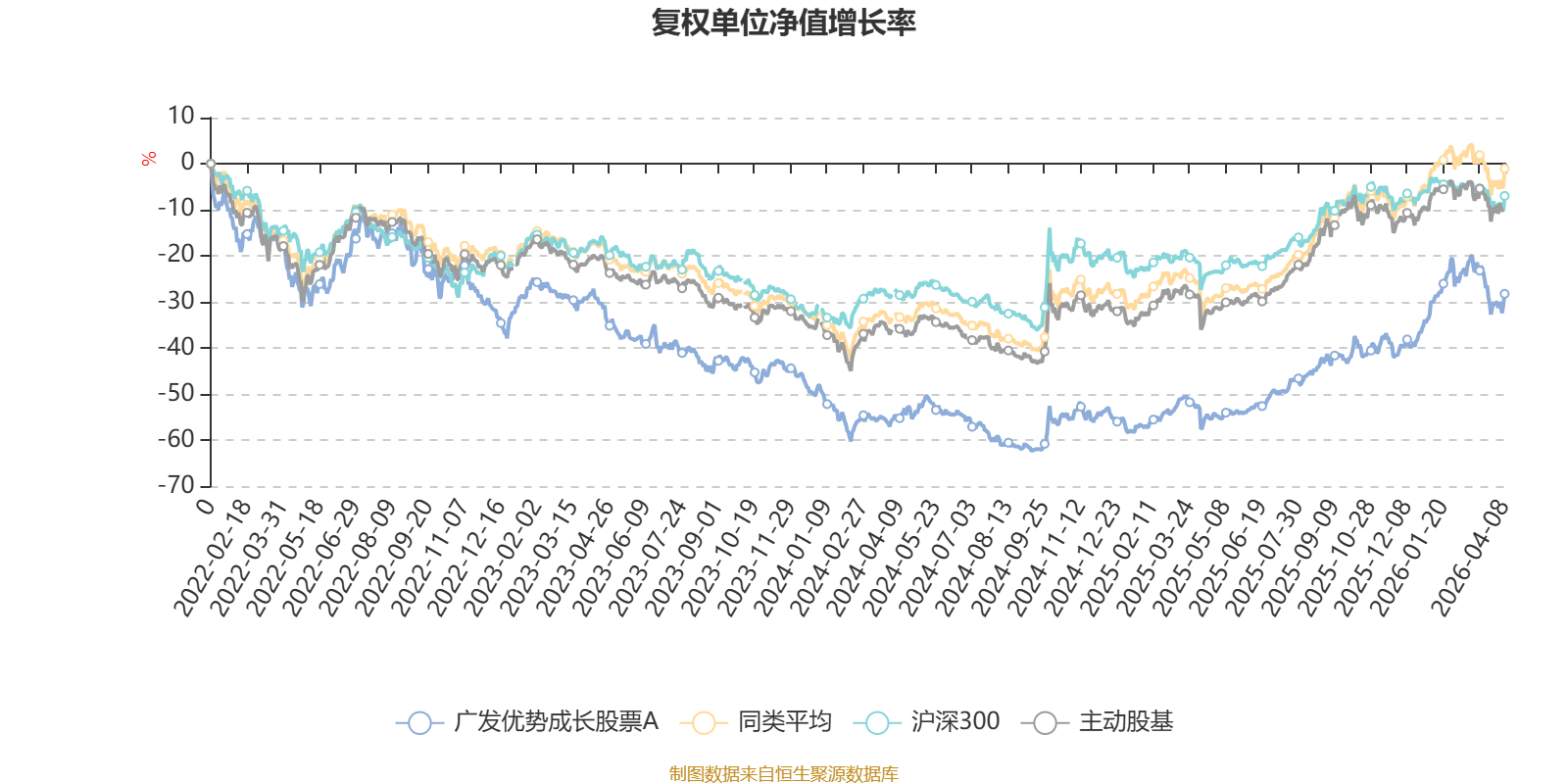 截至4月8日,广发优势成长股票A近三个月复权单位净值增长率为2.42%,位于同类可比基金49/167;近半年复权单位净值增长率为18.84%,位于同类可比基金11/167;近一年复权单位净值增长率为68.10%,位于同类可比基金30/165;近三年复权单位净值增长率为-1.51%,位于同类可比基金128/157。