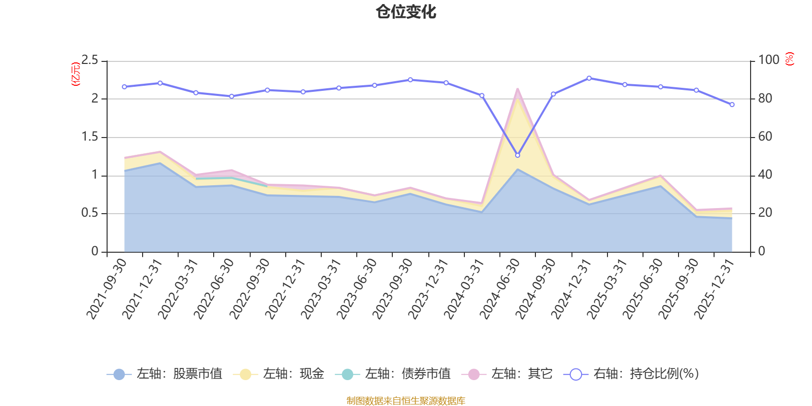 据定期报告数据统计,近三年平均股票仓位为82.8%,同类平均为88.6%。2024年末基金达到90.95%的最高仓位,2024年上半年末最低,为50.6%。
