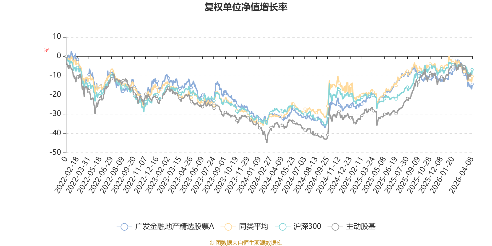 截至4月8日,广发金融地产精选股票A近三个月复权单位净值增长率为-6.33%,位于同类可比基金2/6;近半年复权单位净值增长率为-3.65%,位于同类可比基金4/6;近一年复权单位净值增长率为14.28%,位于同类可比基金3/6;近三年复权单位净值增长率为-0.66%,位于同类可比基金5/5。