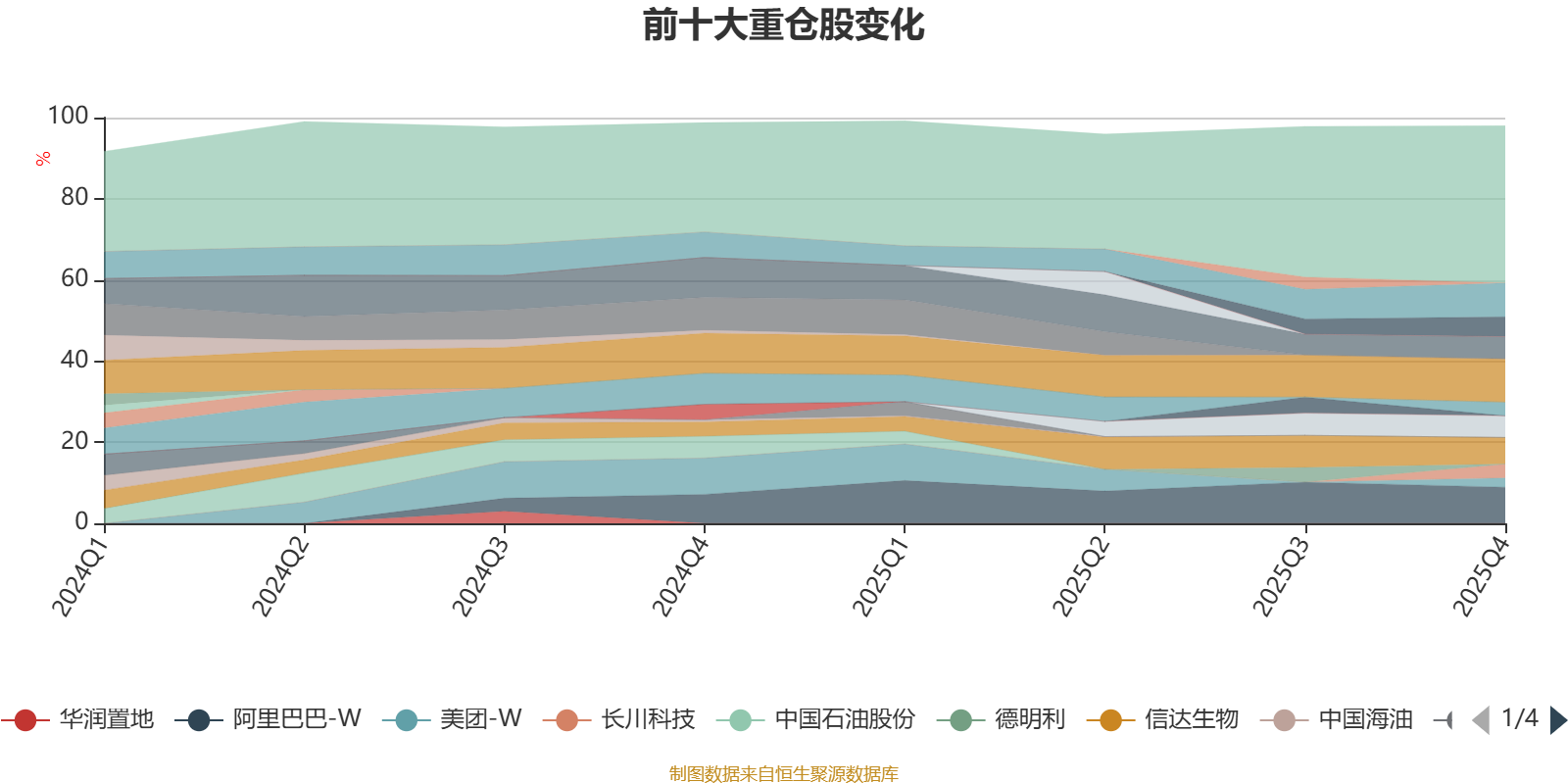 该基金持股集中度较高,近2年前十大重仓股集中度长期超过60%。截至2025年末,基金重仓股分别是腾讯控股、阿里巴巴-W、紫金矿业、信达生物、中国移动、华虹半导体、中国人寿、长川科技、中国海洋石油、美团-W、华虹公司。