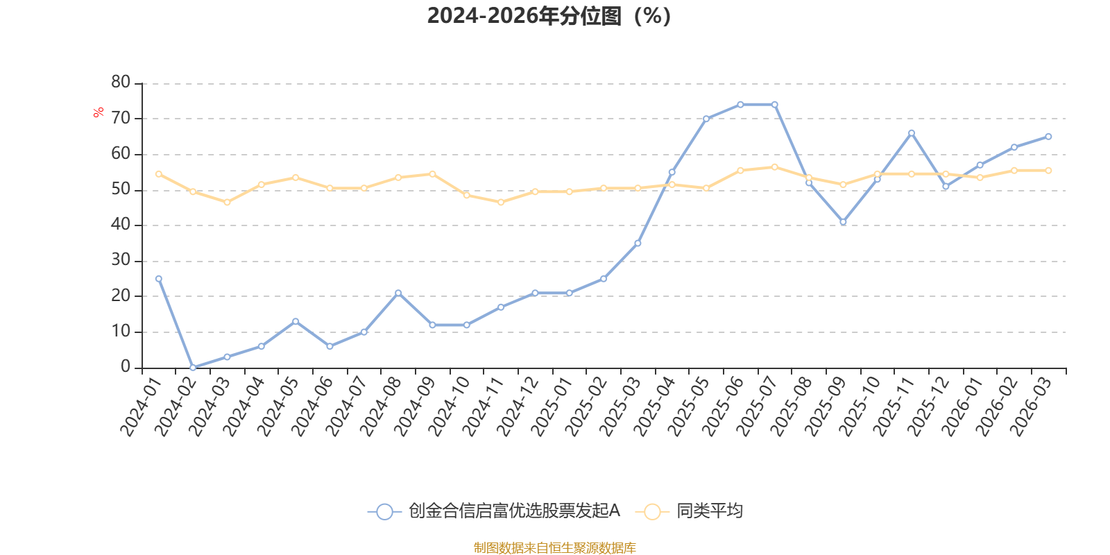 通过所选区间该基金净值增长率分位图,可以观察该基金与同类基金业绩比较情况。图为坐标原点到区间内某时点的净值增长率在同类基金中的分位数。