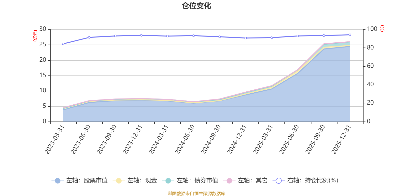据定期报告数据统计,近三年平均股票仓位为91.85%,同类平均为88.36%。2025年末基金达到94.13%的最高仓位,2023年一季度末最低,为84.35%。