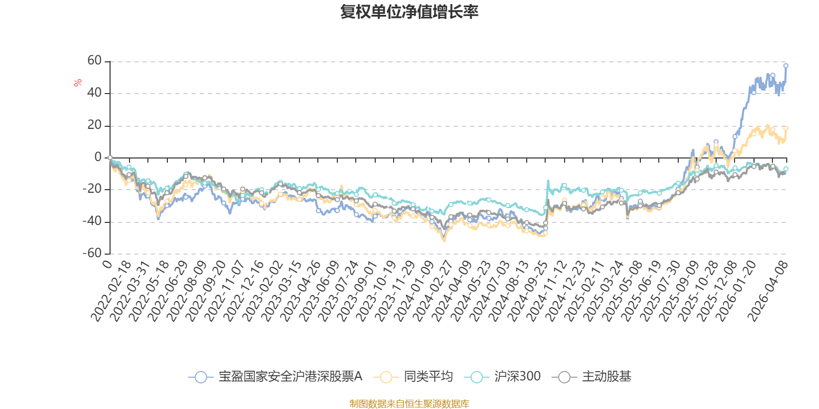 截至4月8日,宝盈国家安全沪港深股票A近三个月复权单位净值增长率为15.06%,位于同类可比基金10/63;近半年复权单位净值增长率为47.47%,位于同类可比基金1/63;近一年复权单位净值增长率为153.05%,位于同类可比基金7/63;近三年复权单位净值增长率为111.46%,位于同类可比基金6/53。