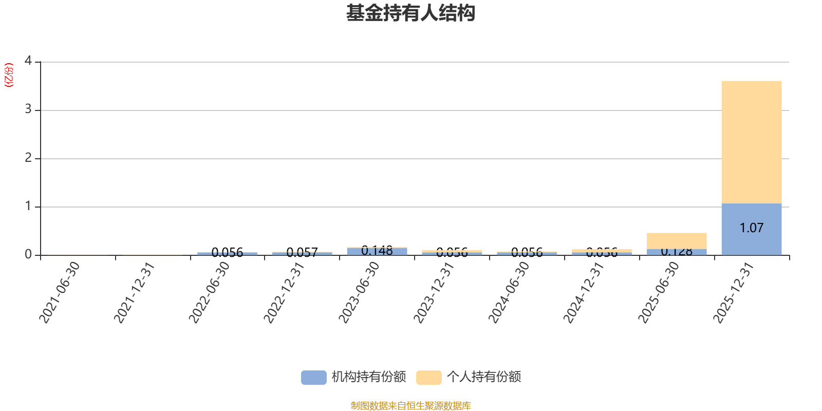 截至2025年12月31日,基金持有人共计4330户,合计持有3.6亿份。其中管理人员工持有82.83万份,占比0.23%,机构持有份额占比29.72%,个人投资者占比70.28%。