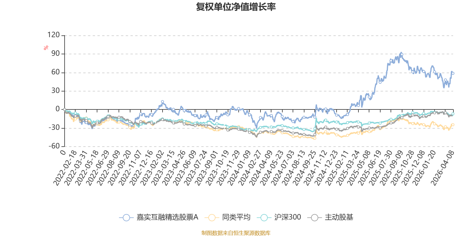 截至4月8日,嘉实互融精选股票A近三个月复权单位净值增长率为-5.27%,位于同类可比基金39/57;近半年复权单位净值增长率为-11.59%,位于同类可比基金36/57;近一年复权单位净值增长率为49.37%,位于同类可比基金2/57;近三年复权单位净值增长率为62.49%,位于同类可比基金1/48。