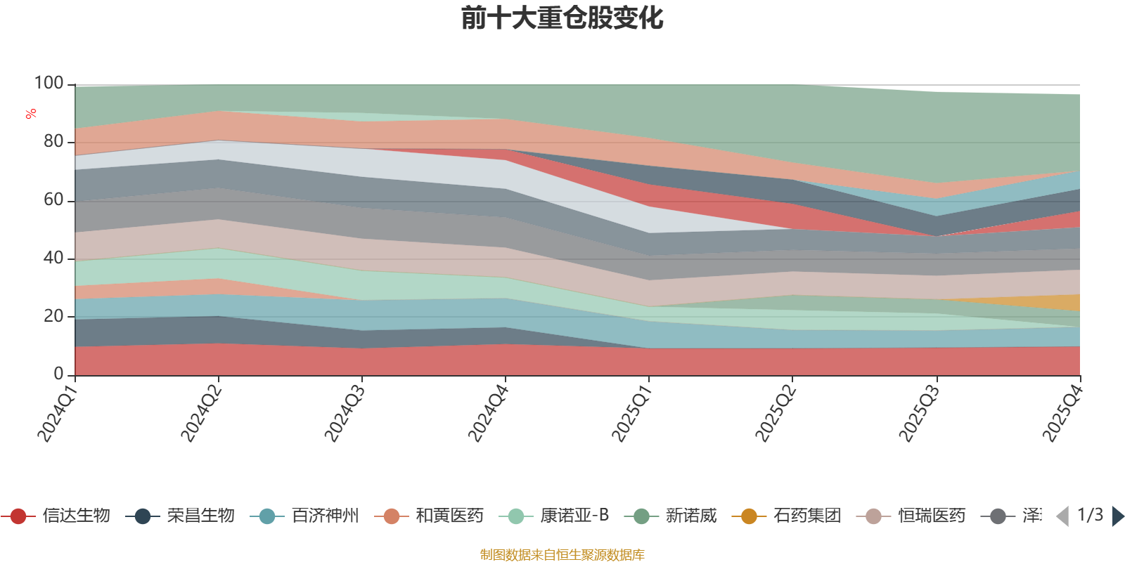 该基金持股集中度较高,且持股标的较为稳定,近2年前十大重仓股集中度长期超过60%。截至2025年末,基金十大重仓股分别是信达生物、恒瑞医药、科伦博泰生物-B、泽璟制药、迪哲医药、百济神州、三生制药、石药集团、益方生物、新诺威。