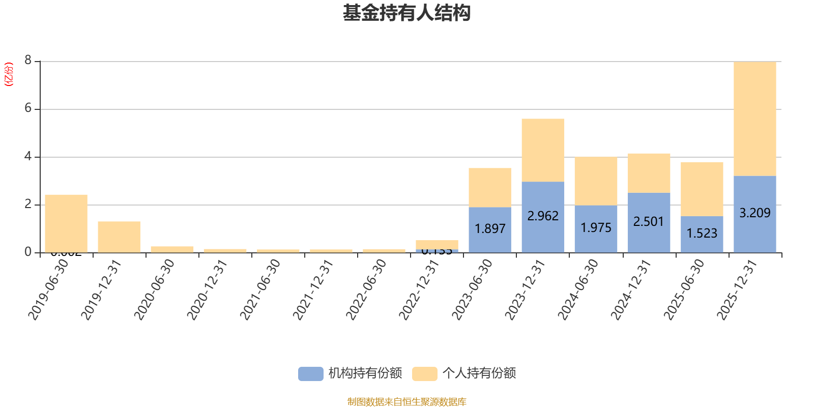 截至2025年12月31日,基金持有人共计4.7万户,合计持有7.96亿份。其中管理人员工持有116.21万份,占比0.15%,机构持有份额占比40.29%,个人投资者占比59.71%。
