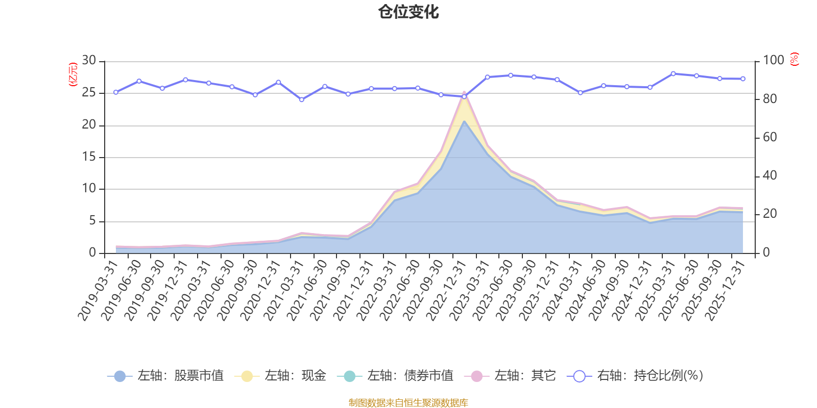 据定期报告数据统计,近三年平均股票仓位为89.86%,同类平均为89.51%。2025年一季度末基金达到93.52%的最高仓位,2021年一季度末最低,为80%。