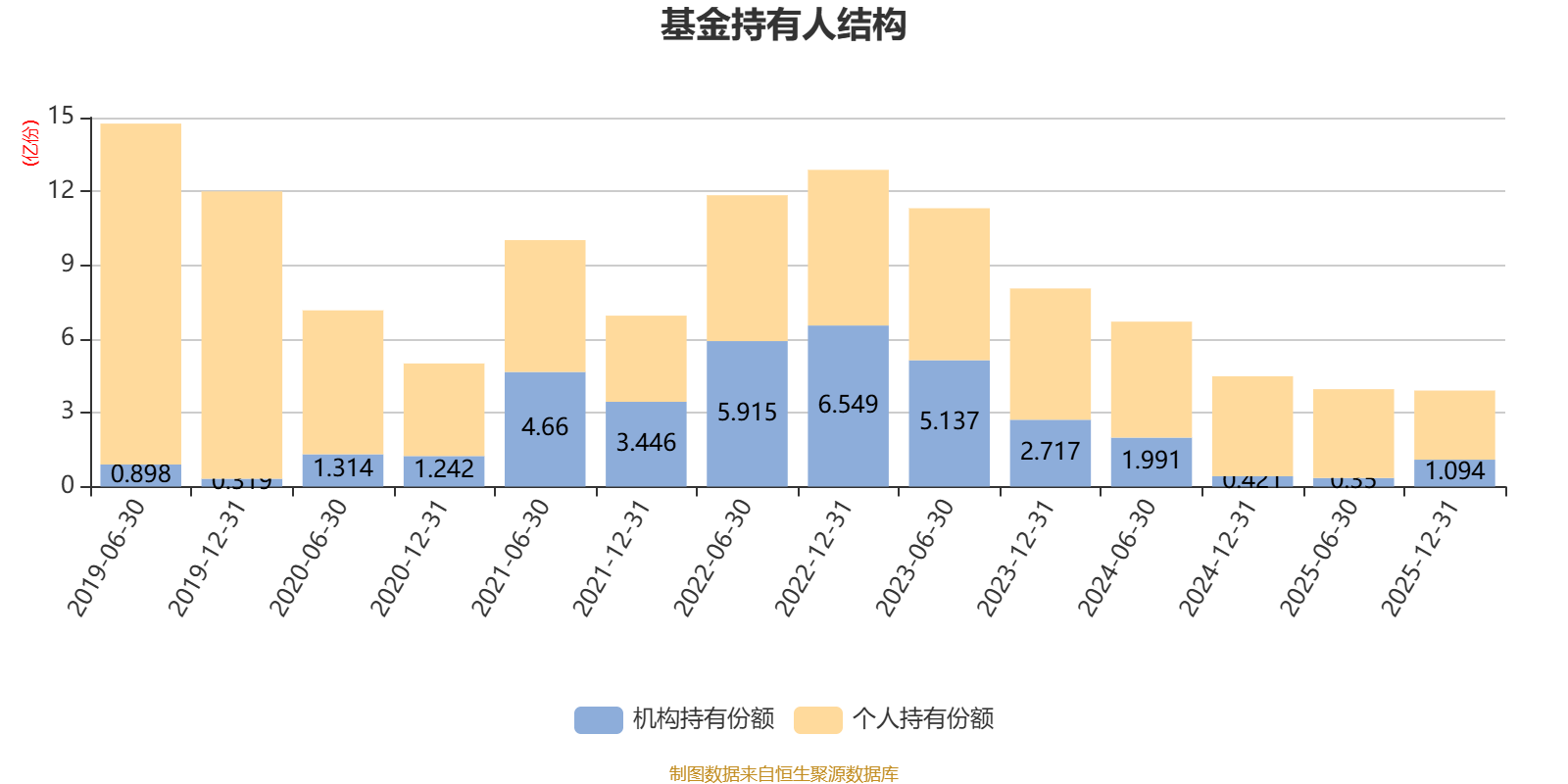 截至2025年12月31日,基金持有人共计15.81万户,合计持有3.9亿份。其中管理人员工持有34.43万份,占比0.09%,机构持有份额占比28.02%,个人投资者占比71.98%。
