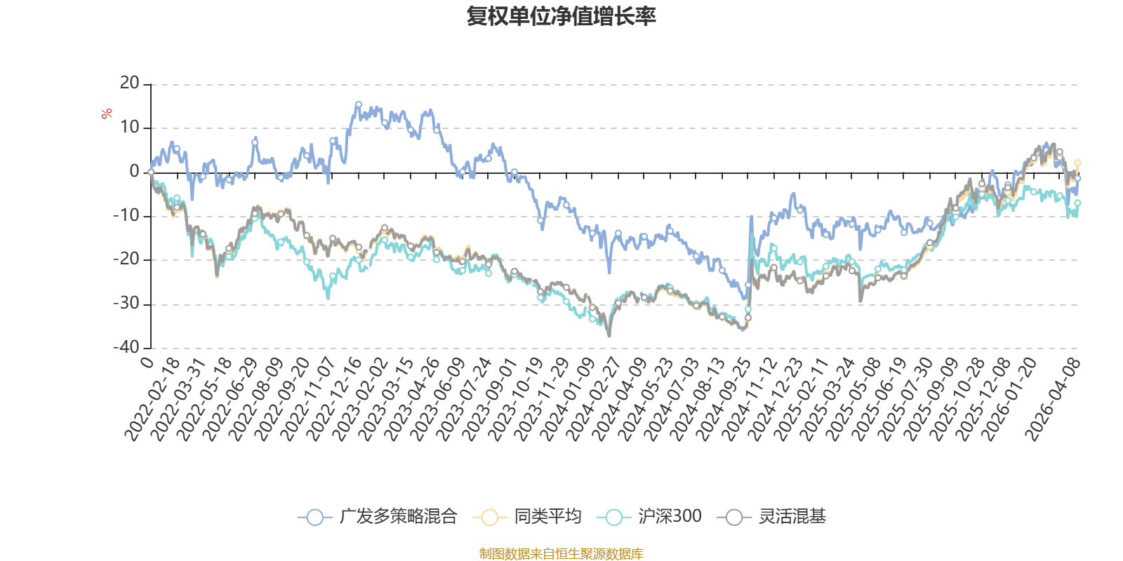 截至4月8日,广发多策略混合近三个月复权单位净值增长率为-3.15%,位于同类可比基金966/1287;近半年复权单位净值增长率为7.21%,位于同类可比基金379/1286;近一年复权单位净值增长率为18.34%,位于同类可比基金924/1286;近三年复权单位净值增长率为-13.38%,位于同类可比基金1139/1286。