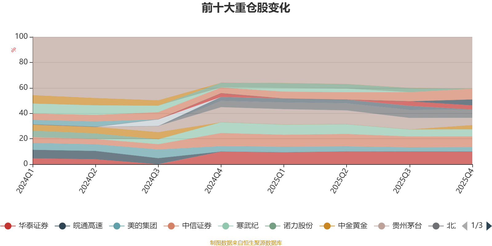 该基金持股集中度较高。截至2025年末,基金十大重仓股分别是华泰证券、紫金矿业、中信证券、北方华创、贵州茅台、寒武纪、中际旭创、美的集团、中金黄金、宁德时代。
