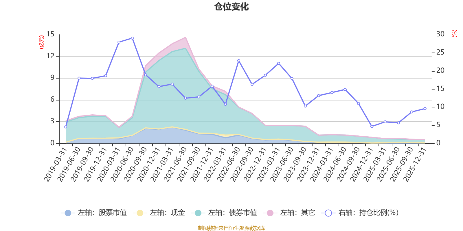 据定期报告数据统计,近三年平均股票仓位为11.49%,同类平均为19.2%。2020年上半年末基金达到29.05%的最高仓位,2019年一季度末最低,为4.54%。