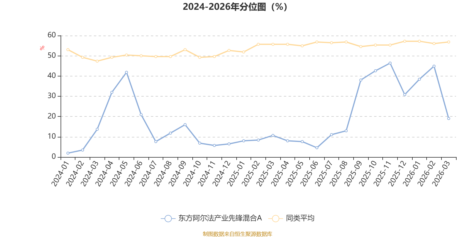 通过所选区间该基金净值增长率分位图,可以观察该基金与同类基金业绩比较情况。图为坐标原点到区间内某时点的净值增长率在同类基金中的分位数。