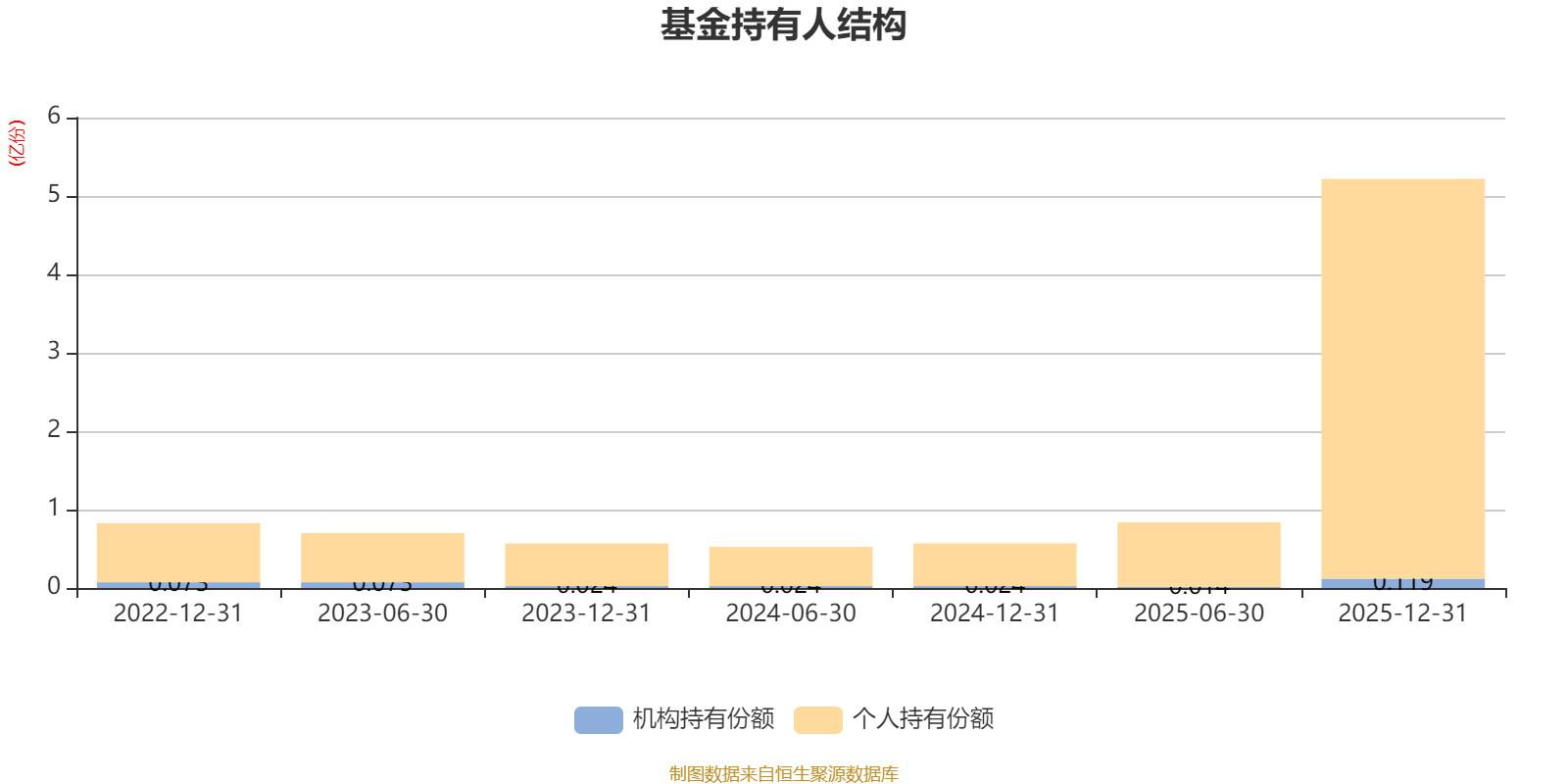 截至2025年12月31日,基金持有人共计4.24万户,合计持有5.22亿份。其中管理人员工持有12.61万份,占比0.02%,机构持有份额占比2.28%,个人投资者占比97.72%。