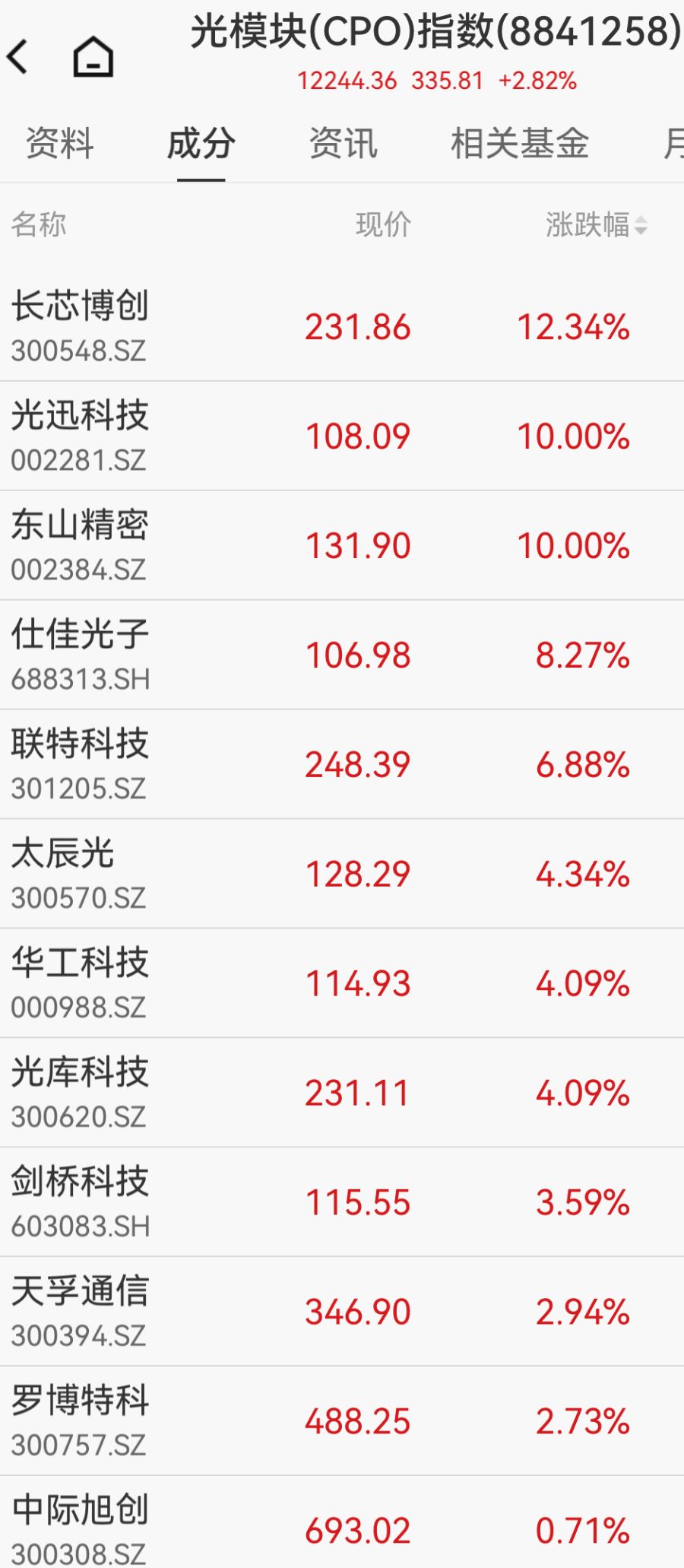 4月9日,光模块(CPO)指数震荡走高,长芯博创涨超12%领涨,东山精密2天2板,光迅科技涨停,仕佳光子、联特科技涨超5%跟涨。