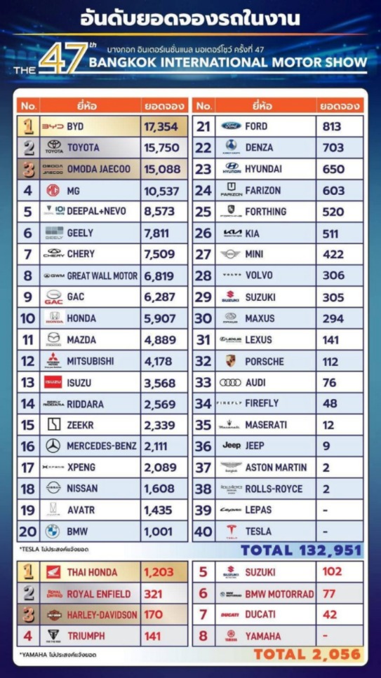 2024年第45届曼谷车展,总订单量5.34万辆。丰田以8540辆排名第一,比亚迪以5345辆排名第二,本田第三。前十名中,中国品牌占五席,其余为日系品牌。当时中国品牌的集体亮相已开始引起市场关注,但头部位置仍由丰田和本田占据。