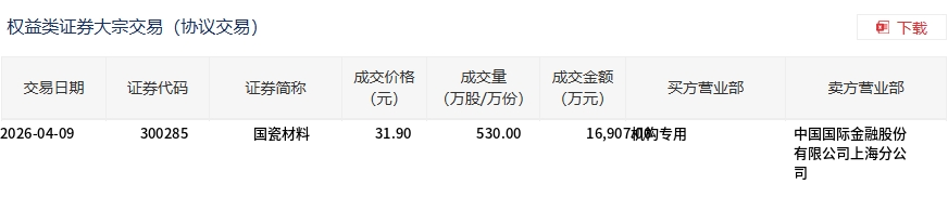 4月9日,国瓷材料大宗交易成交530万股,成交额1.69亿元,占当日总成交额的16.35%,成交价31.9元,较市场收盘价31.88元溢价0.06%。
