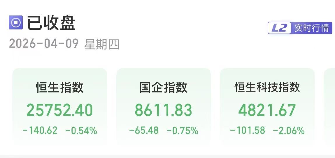 上证报中国证券网讯(刘禹希记者严晓菲)4月9日,港股三大指数收跌。截至收盘,恒生指数跌0.54%,报25752.4点;恒生国企指数跌0.75%,报8611.83点;恒生科技指数跌2.06%,报4821.67点。