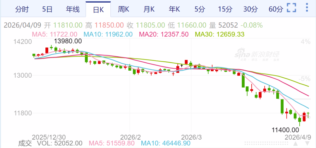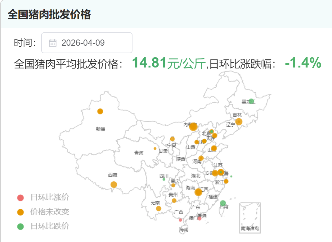 供需错位导致猪肉价格不断调整。在现货市场,农业农村部官网公布的数据显示,4月8日全国猪肉平均批发价格为15.02元/公斤,日环比跌1.38%。4月9日,全国猪肉平均批发价格再降至14.81元/公斤,日环比跌1.4%。在零售终端,广州日报全媒体记者查阅广州市发展和改革委员会公布的数据获悉,2026年3月30日—4月5日,广州市猪肉价格小幅下降,四种猪肉(瘦肉、有皮上肉、五花肉和排骨)综合零售均价为19.32元/500克,环比下降1.82%。